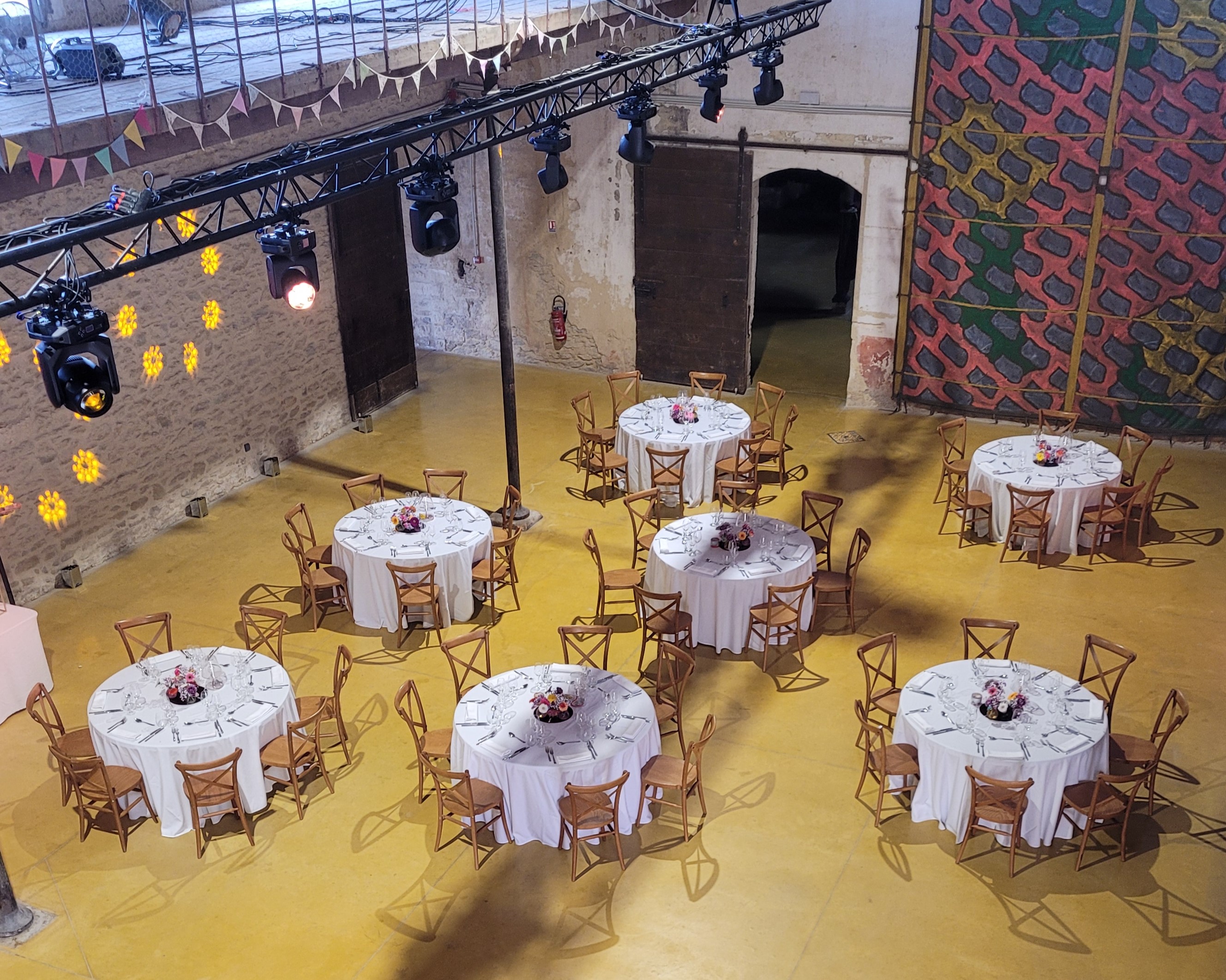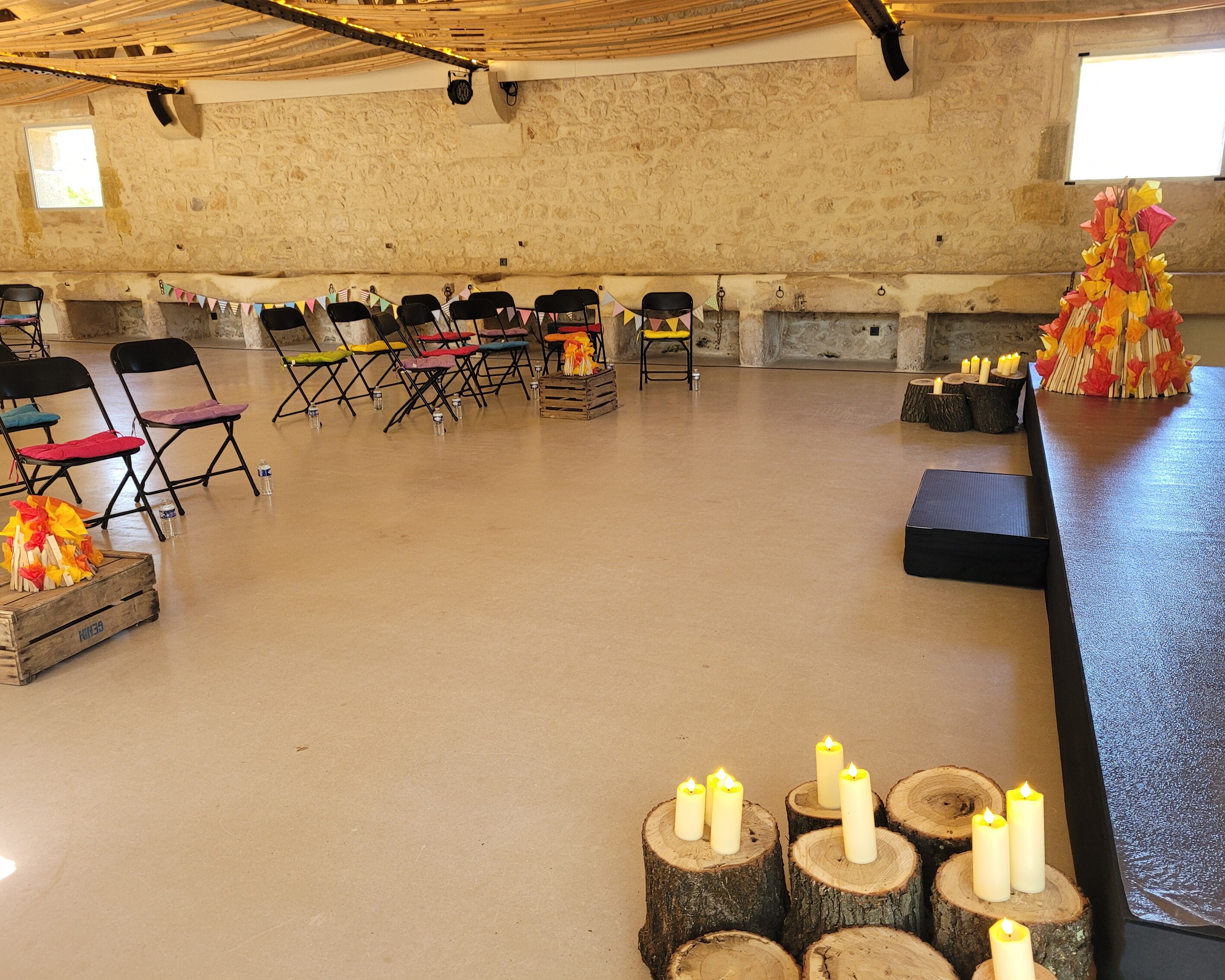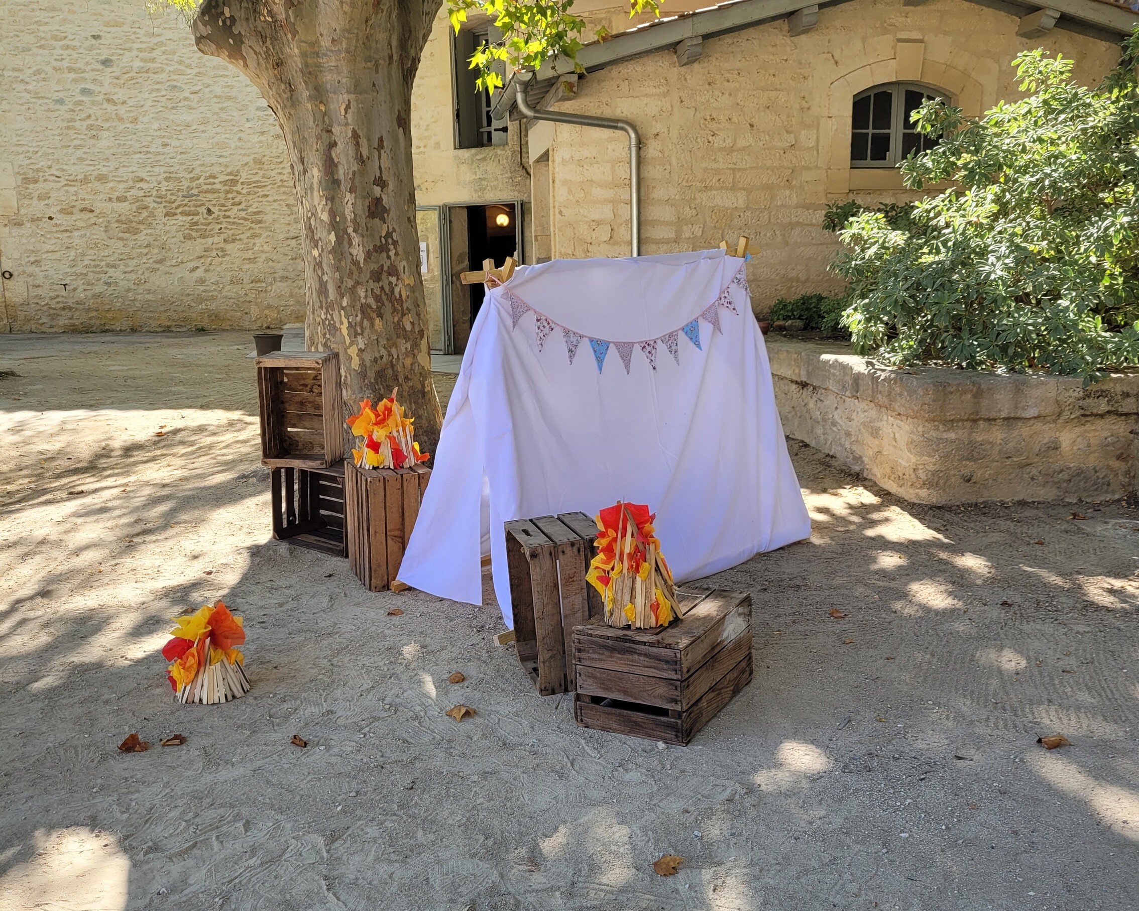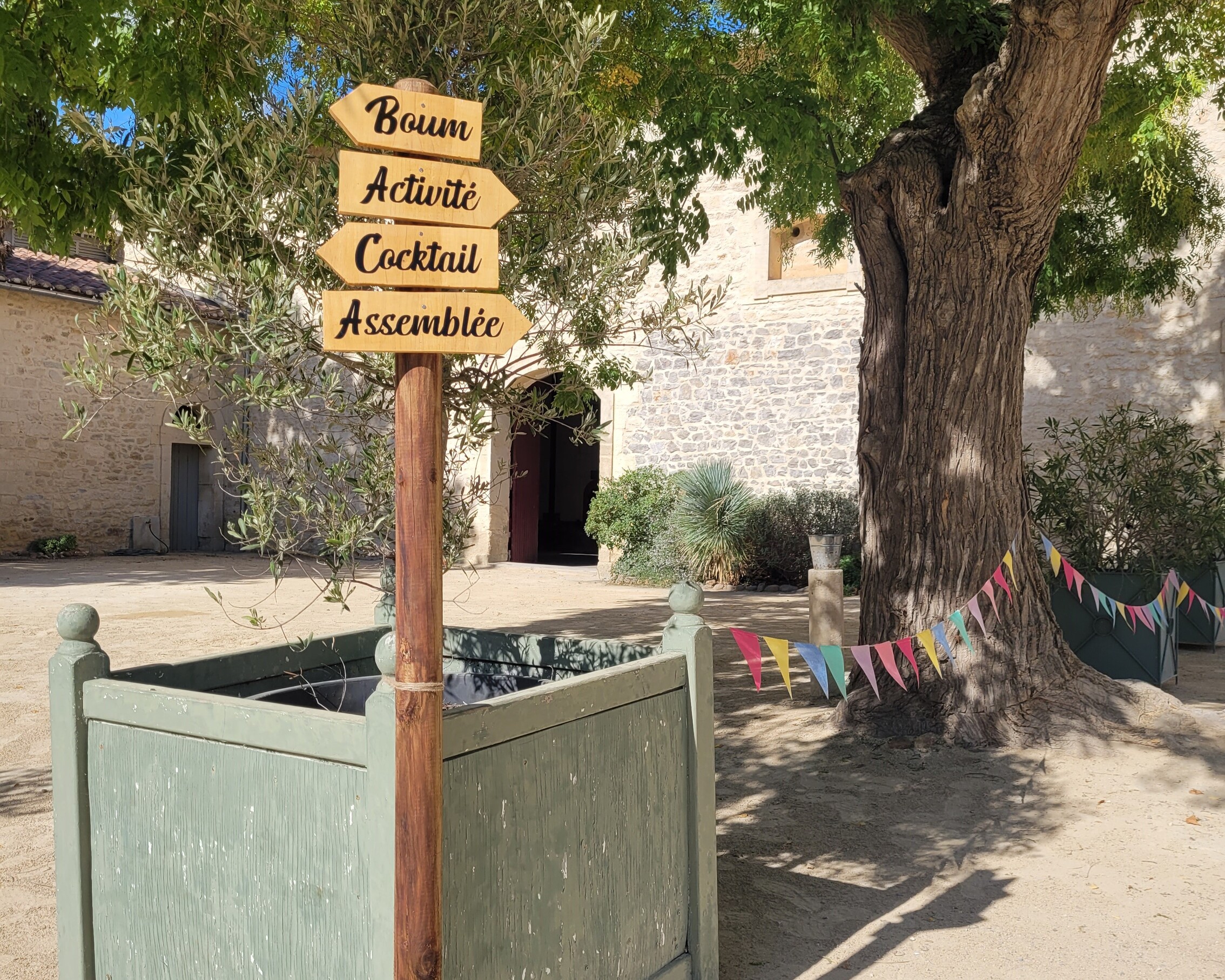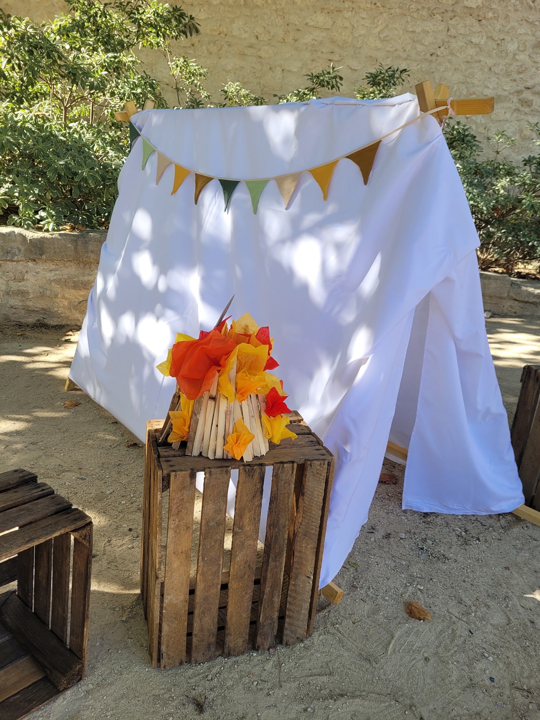 La journée s’est déroulée autour d’un thème colonie de vacances, avant de laisser place le soir à une boum 90’s. Le défi était d’imaginer un décor pour chaque thème tout en gardant une continuité pour que les événements se fassent écho et que la journée soit cohérente. Dès l’arrivée, des panneaux d’accueil et une signalétique guidaient les participants à travers les différents espaces. Des fanions en tissu colorés, présents tout au long de la journée, créaient un fil conducteur entre les deux univers.