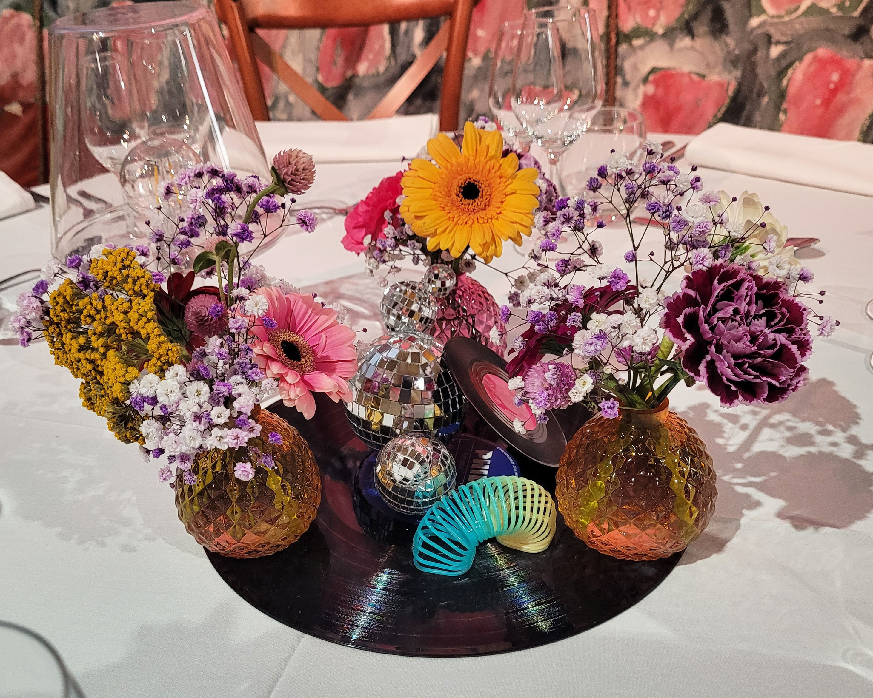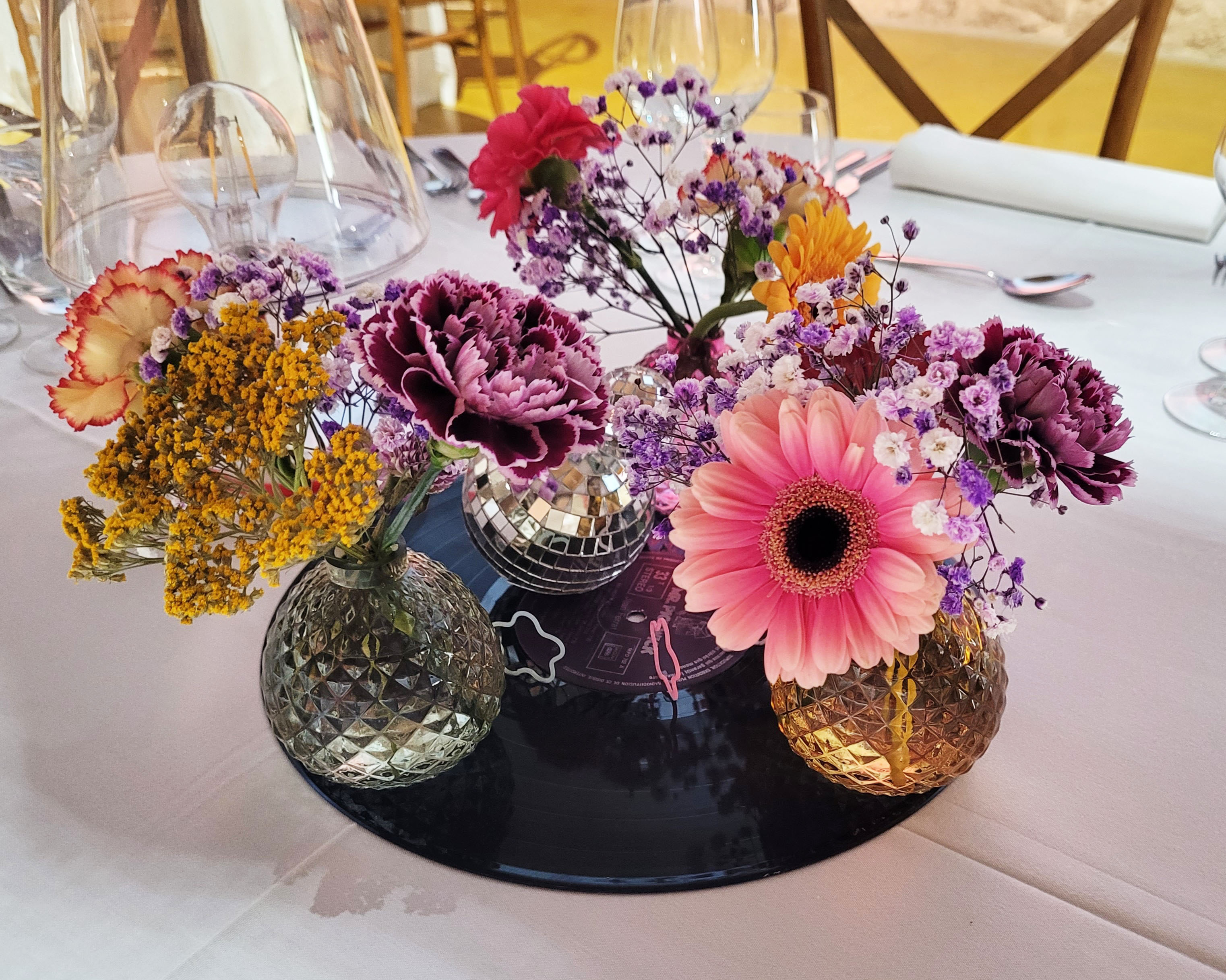 Un feu de camp géant, véritable pièce maîtresse de cette journée, a été réalisé à la main à partir de polystyrène, de bois, de mousse expansive et de papier de soie. Pour la soirée, place à la boum 90’s : un univers coloré, festif et rétro. Des centres de table sur-mesure ont été imaginés pour l’occasion en vinyles, boules disco et fleurs des champs aux couleurs pop ! Quelques détails ont été ajoutés également : dés en fourrure et petits ressorts ondamania.