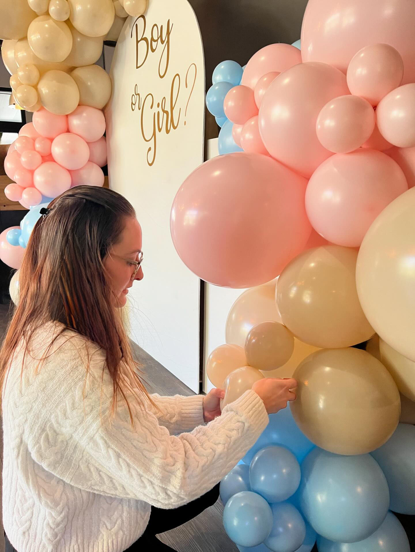 Pour cette Gender Reveal, j’ai eu le plaisir de concevoir deux arches de ballons aux teintes douces et poudrées : un mélange délicat de beige, de rose et de bleu pour envelopper ce moment unique d’une atmosphère tendre et poétique.